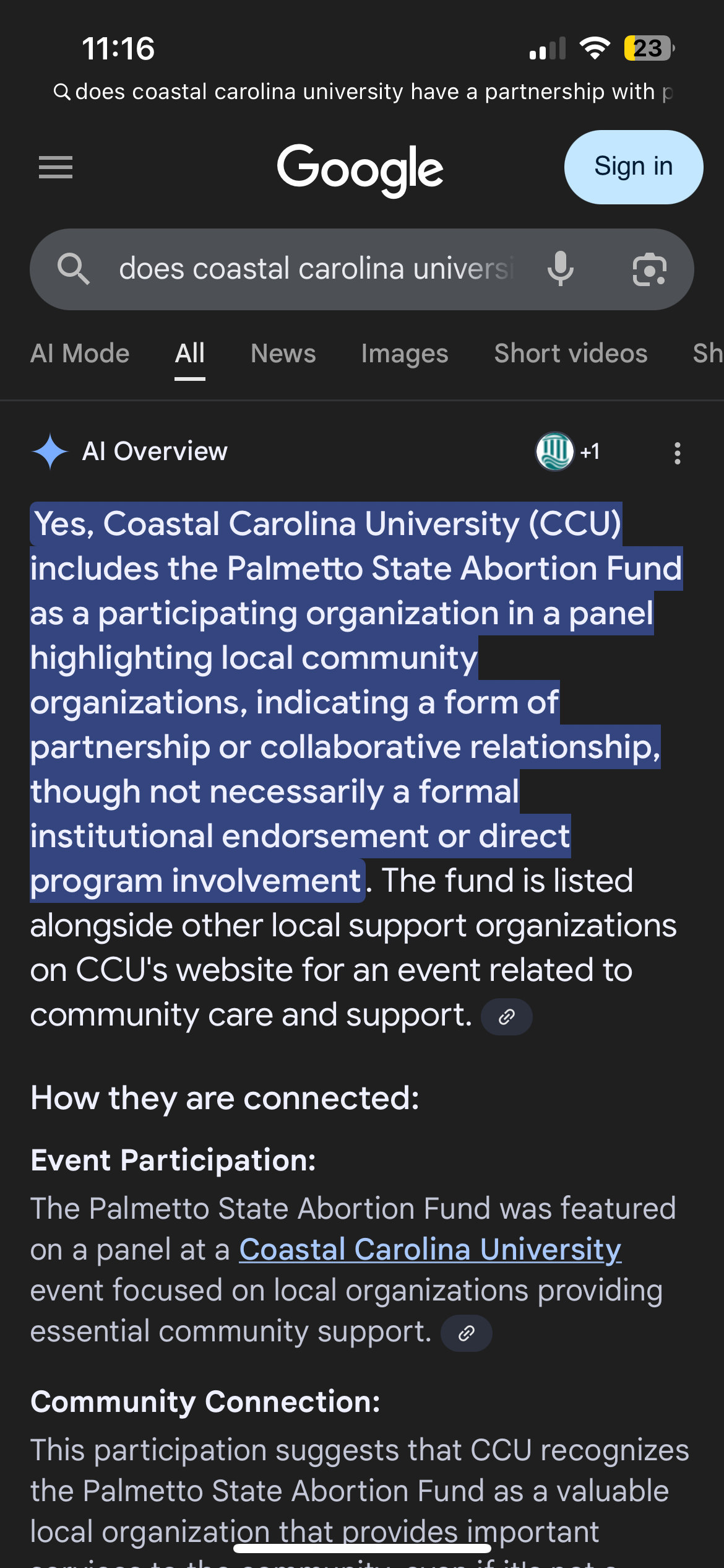 Coastal Carolina University (CCU) maintains direct ties to the Palmetto State Abortion Fund through Dr. Ina Seethaler, Director of the Women’s & Gender Studies program, who also serves as PSAF’s Director of College Outreach and advisor to the campus Planned Parenthood Action group.