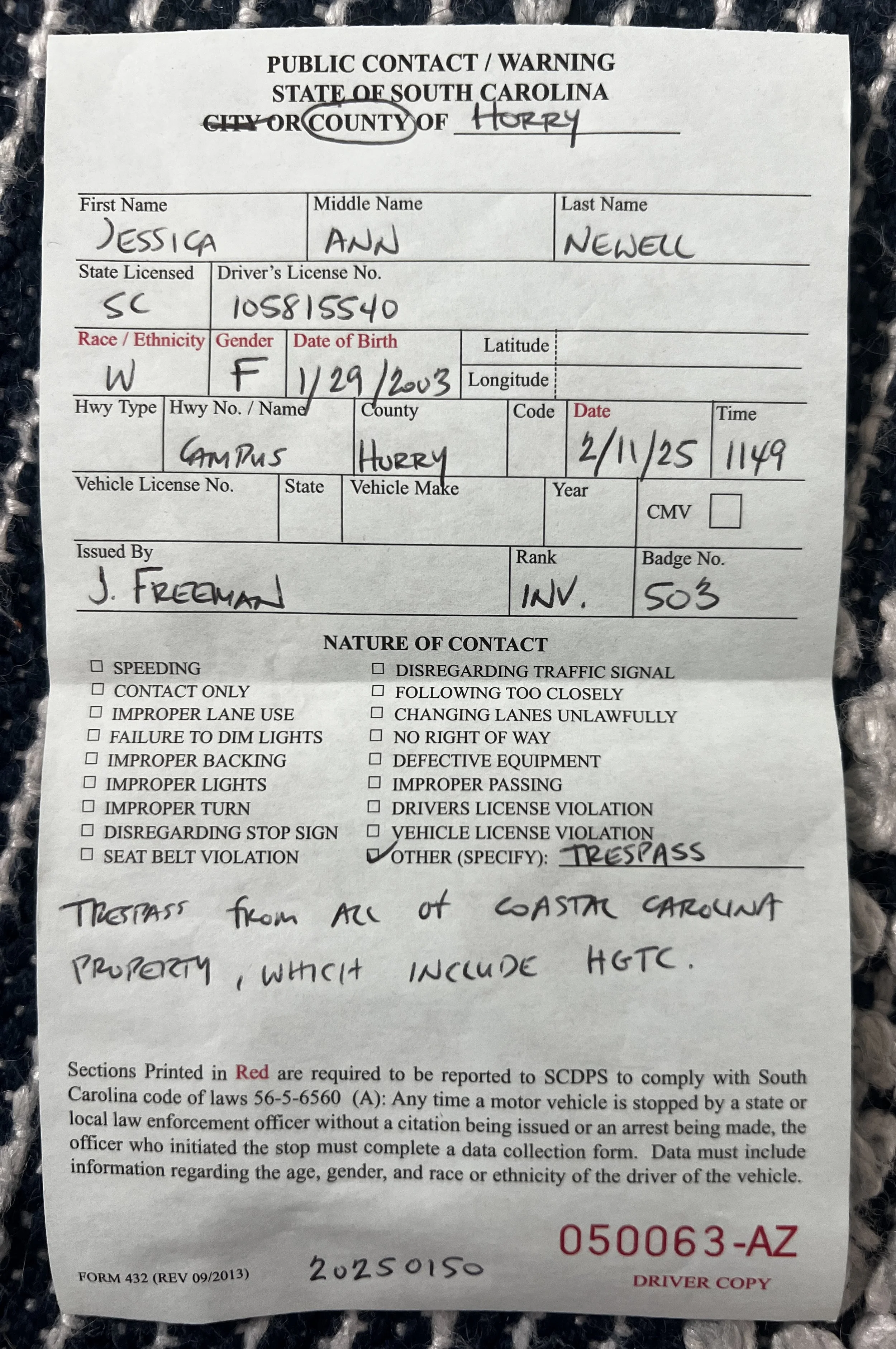 The individual was in a public campus space, engaging in constitutionally protected speech, yet university officials claimed the content did not qualify as “free speech.” CCU police threatened her, along with two like-minded students, with arrest.